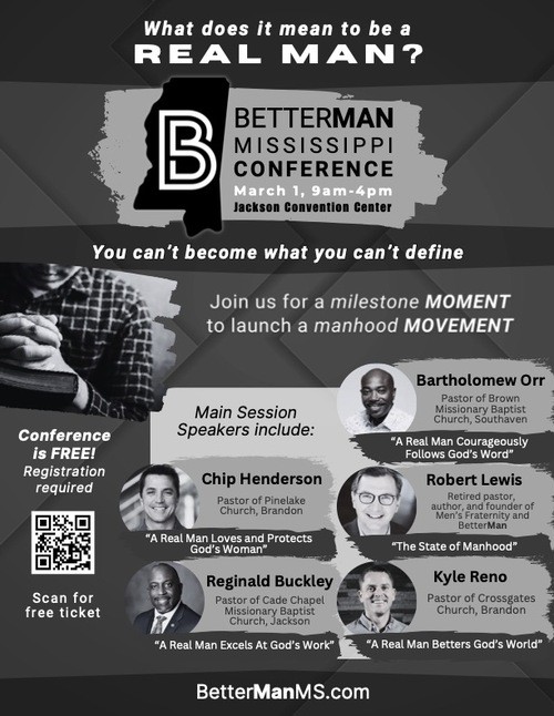 We will be attending the Free BetterMan Mississippi Conference on March 1 which is hosted by local leaders who desire to see our state transformed by godly men of all ages. The purpose of the conference is to launch a sustainable movement in MS calling men back to God’s good & timeless design for manhood. Will you join us?